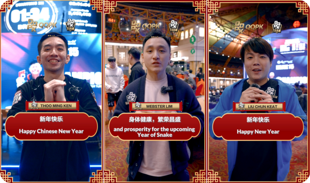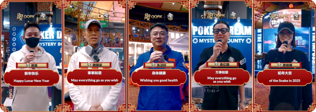 QQPK战队由亚洲各地顶尖华人牌手组成,中国农历新年也是他们一年中最重要的节日!在PD15赛场征战的QQPK战队成员们在现场录制了祝福视频,一同为扑克爱好者们献上了蛇年祝福!