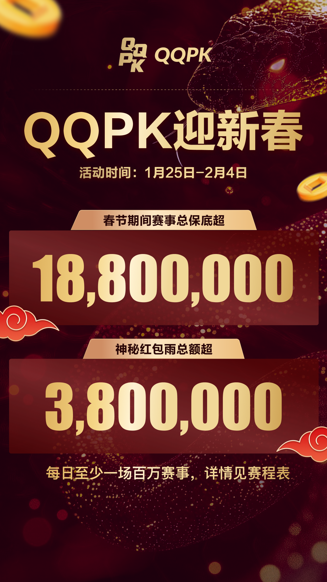 喜迎蛇年!QQPK春节系列赛火热开启!自1月25日至2月4日,每日都有百万保底的大型比赛!除夕夜更有免费参与的百万保底赛事,紧接1月31日的迎财神五百万赛重磅接档,陪您共同守岁,喜盼蛇年!