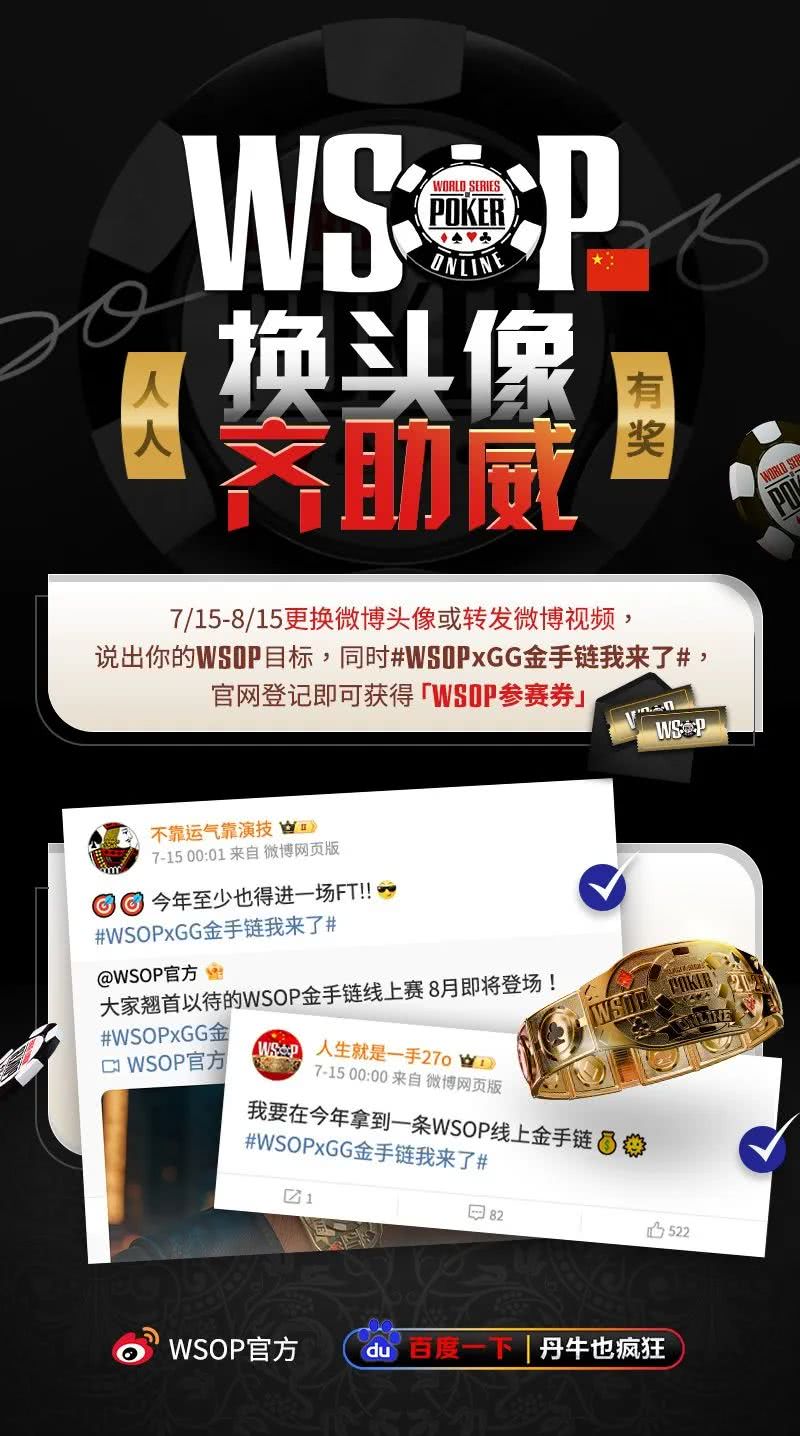 GG为助力国人迎接8月的【WSOP金手链线上赛】,于7月15日发起『WSOP换头像齐助威』活动,所有扑克爱好者都可以参加,人人有奖!