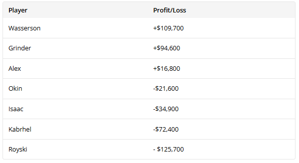 到当晚游戏结束时,Wasserson成为最大赢家,盈利$109,700。Mizrachi以$94,600盈利紧随其后。Alex盈利$16,800,排在第三位。