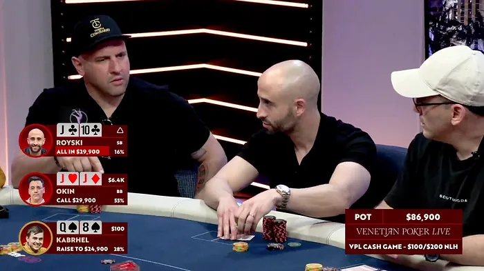 有好几个人straddle,JRB用9♦8♦跟注,Kabrhel用Q♠8♠全下24,900。Royski在小盲位全下29,900,他的牌是J♣10♣。接着,Okin在大盲位用J♥J♦跟注,两人有出局风险。