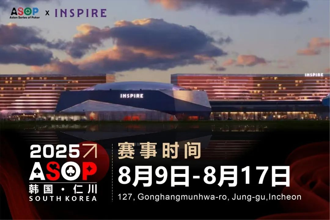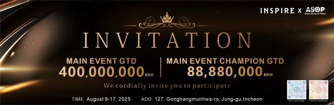 一场扑克的超级盛宴即将震撼来袭!8月9日-17日,ASOP将在韩国仁川的INSPIRE酒店热血开赛,主赛事保底400,000,000KRW,其中冠军保底88,880,000KRW,这是一场属于扑克玩家的狂欢,更是你证明自己的绝佳舞台!