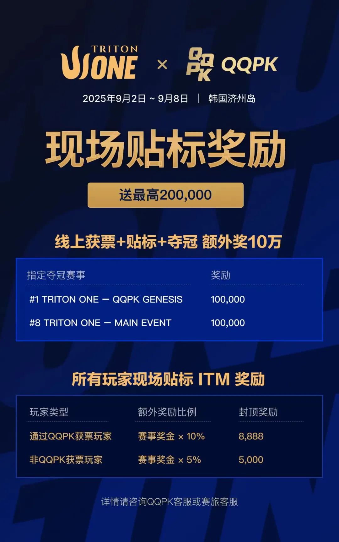 作为首站冠名赞助商,QQPK已于8月4号同步推出了三大Triton ONE主题系列活动,包括赛前卫星赛到现场额外EV福利,为全世界扑克爱好者开启通往传奇之路的大门。