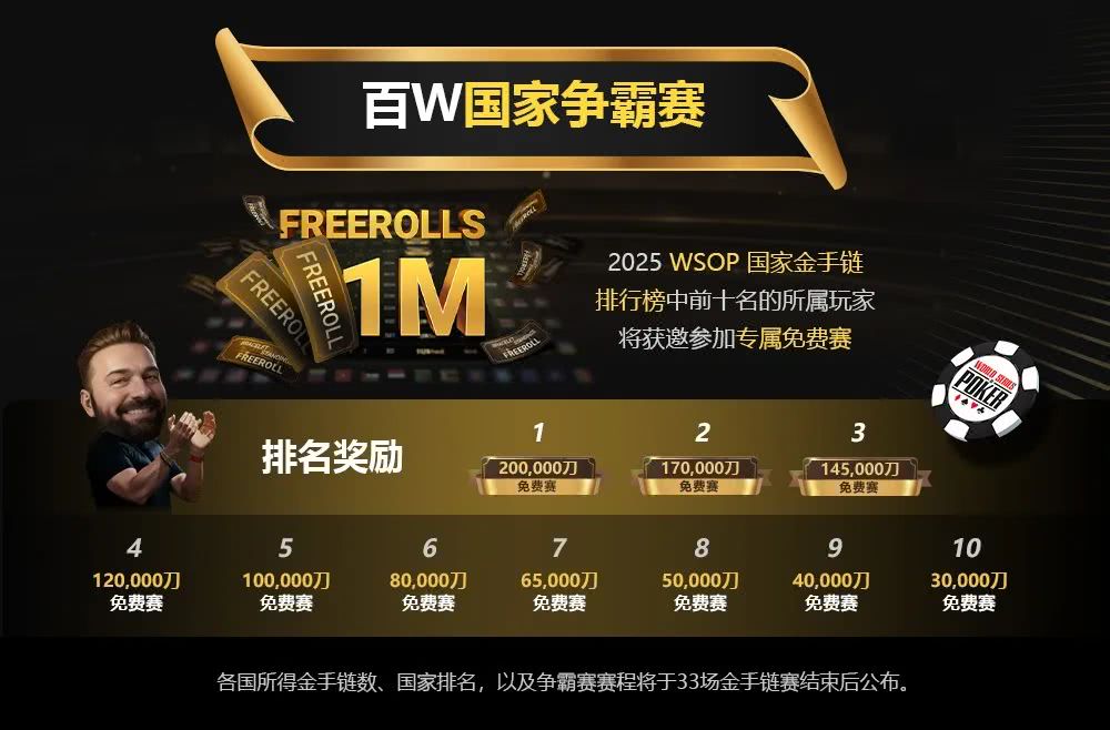 也别忘了“百万国家争霸赛”活动——金手链赛最终总积分前10名的国家,将解锁特殊免费赛,参与对象包含所有报名过金手链赛 (包含卫星赛) 的选手。