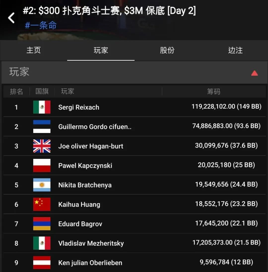 除了黄凯华闯入决赛桌外,本场赛事还有多位中国玩家顺利打进Day2奖励圈: