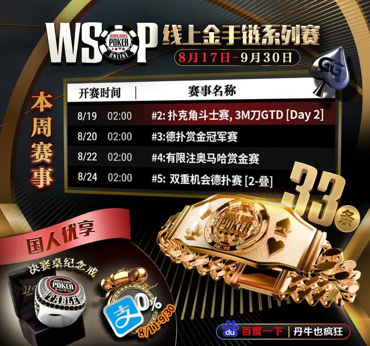 你准备好为金手链而战了吗?2025年最受期待的线上扑克盛典——《GGPoker WSOP线上金手链系列赛》8月17日-9月30日重磅开打,共33条金手链等待颁发!