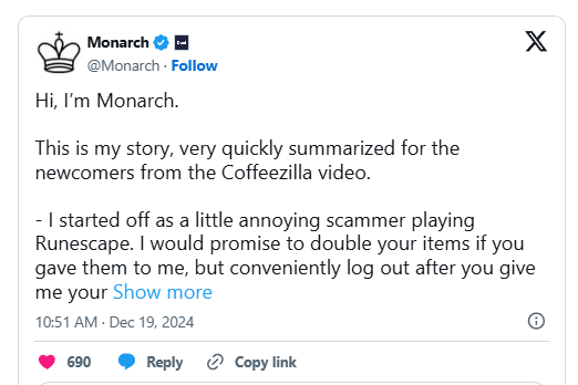 他的起点并不光彩。在童年时期,大概6-13岁期间,Monarch在一个叫做Runescape的角色扮演游戏中诈骗。