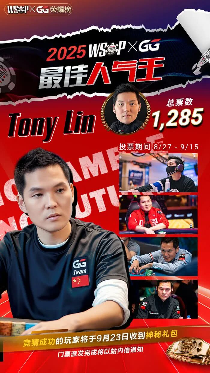 2025 WSOP×GG荣誉榜“最佳人气王”票选结果揭晓,GG中国队大使Tony Lin凭借1,285票高居榜首,成为本届人气王!投票期间成功竞猜Tony Lin登顶的玩家,将于9月23日在游戏内收到【神秘礼包】,记得准时上线领取~