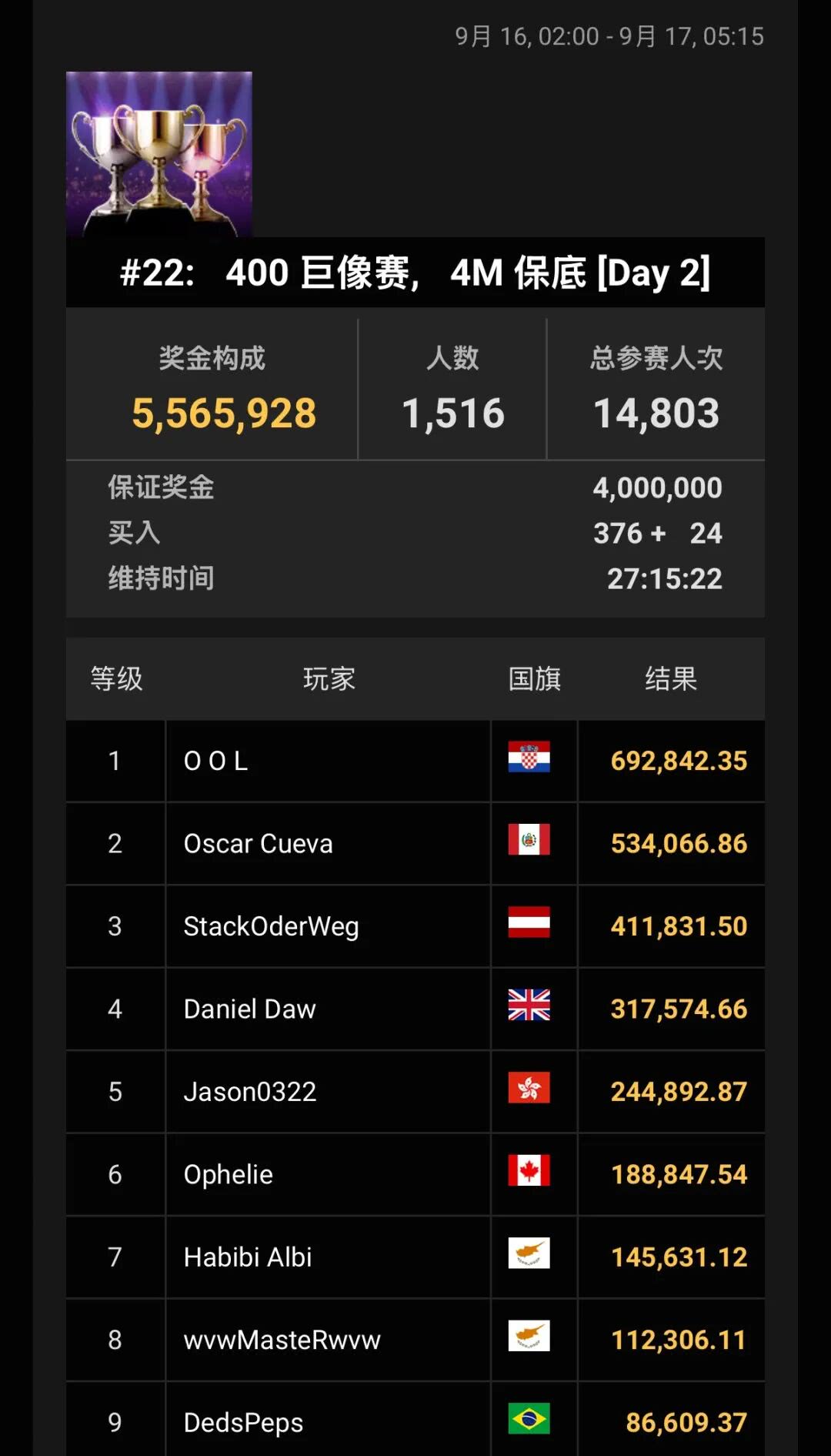作为WSOP最受欢迎的赛事之一,#22:巨像赛吸引了全球14,803人次参加 (去年13,147人),总奖池高达5,565,928刀,远超最初设定的400万刀保底,并有1,516人打进前圈,斩获最低奖励786刀,