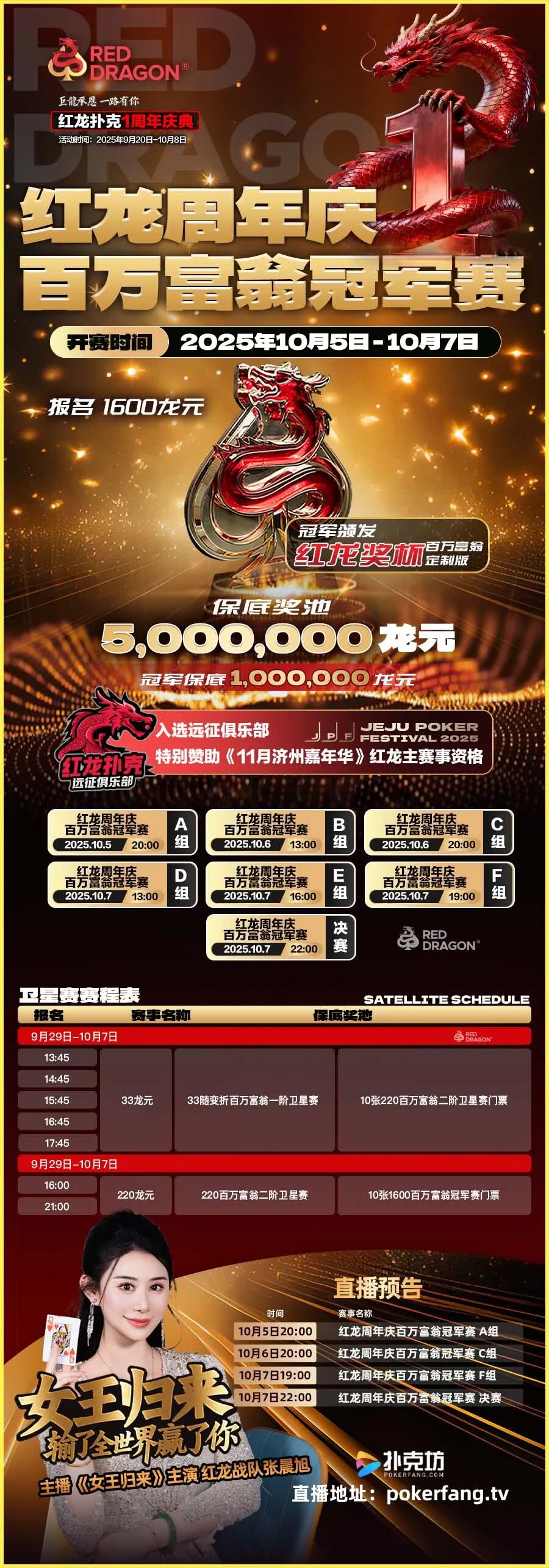 10月5日至7日,红龙周年庆百万富翁冠军赛即将打响,保底奖池高达5,000,000,冠军更是至少获得百万保底奖金。张晨旭将以主播身份,亲自直播见证这一巅峰对决。