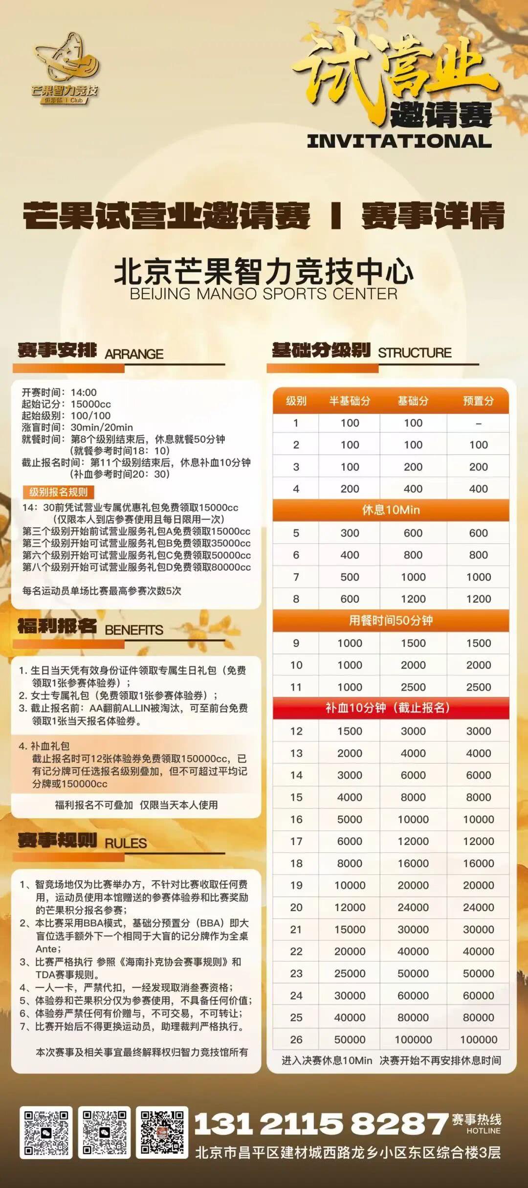 3、截止报名前:AA翻前ALLIN被淘汰,可至前台免费领取1张当天报名体验卡。