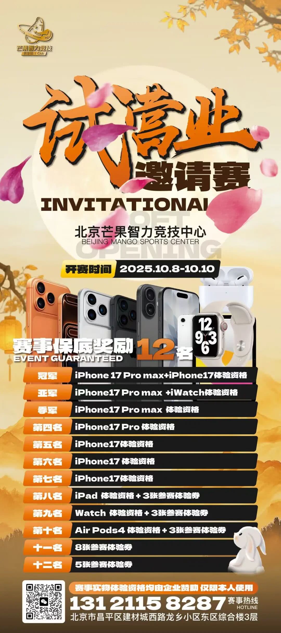 中秋嗨玩新地标!北京芒果智力竞技中心(10月8日-10日)试营业邀请赛,壕送 iPhone 17+LABUBU 潮玩!