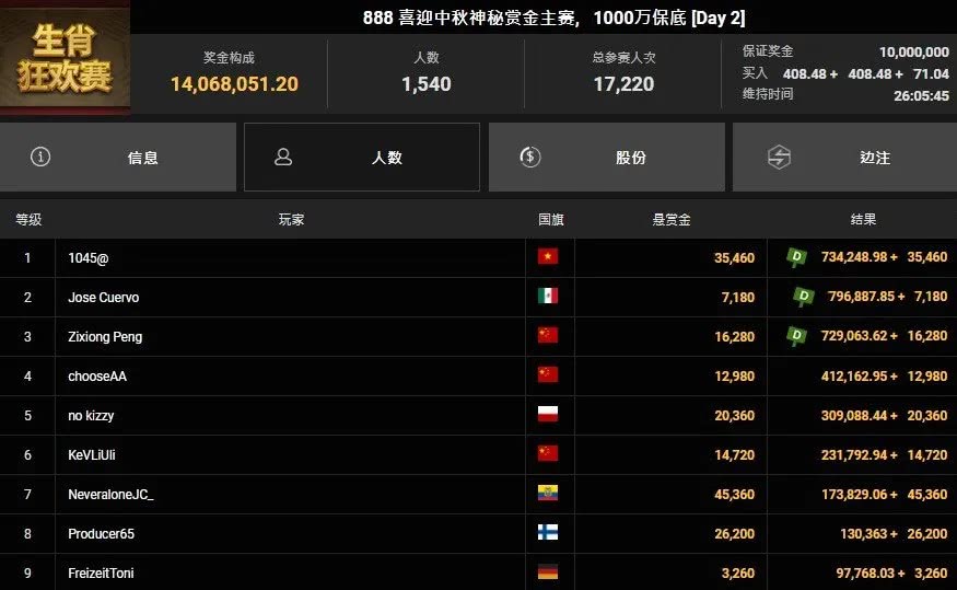系列压轴赛事——“888喜迎中秋神秘赏金主赛”于10月12日晚21:00打响,吸引全球17,220人次参赛,创造奖池高达14,068,051.20,当中有1,540位玩家顺利打进前圈。