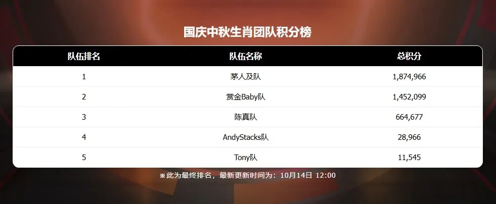 ▌前期:茅人及队展现压倒性统治力,主力选手taotao16888888状态火热,多次打入“生肖狂欢赛”奖励圈,建立断崖式领先;