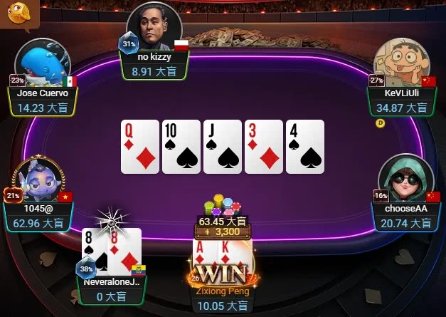 随后,他再度凭着AKs淘汰厄瓜多尔选手,除了开出3,300神秘赏金,还一举成为CL。来到三人阶段,Zixiong Peng的码量和越南选手相去不远,墨西哥选手多约15BB。