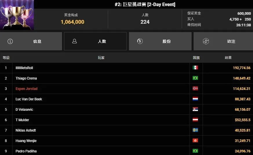 而同一时间登场的还有#2:巨星挑战赛,参赛阵容无愧其名,世界顶尖牌手纷纷齐聚,包括中国金手链得主黄文杰,以及WSOP主赛冠军Espen Jorstad。