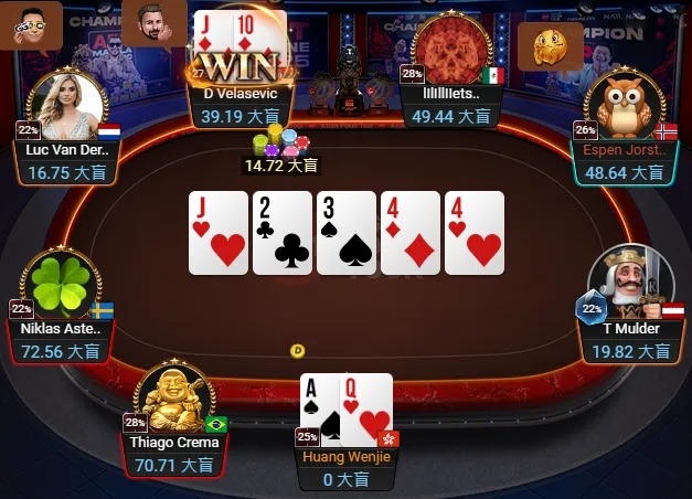 而决赛桌阵容更是星光熠熠:线上MTT巨擘Niklas Astedt、2022年拉斯维加斯WSOP主赛冠军Espen Jorstad,以及去年GGPoker WSOP单挑赛线上金手链得主黄文杰齐聚一堂。