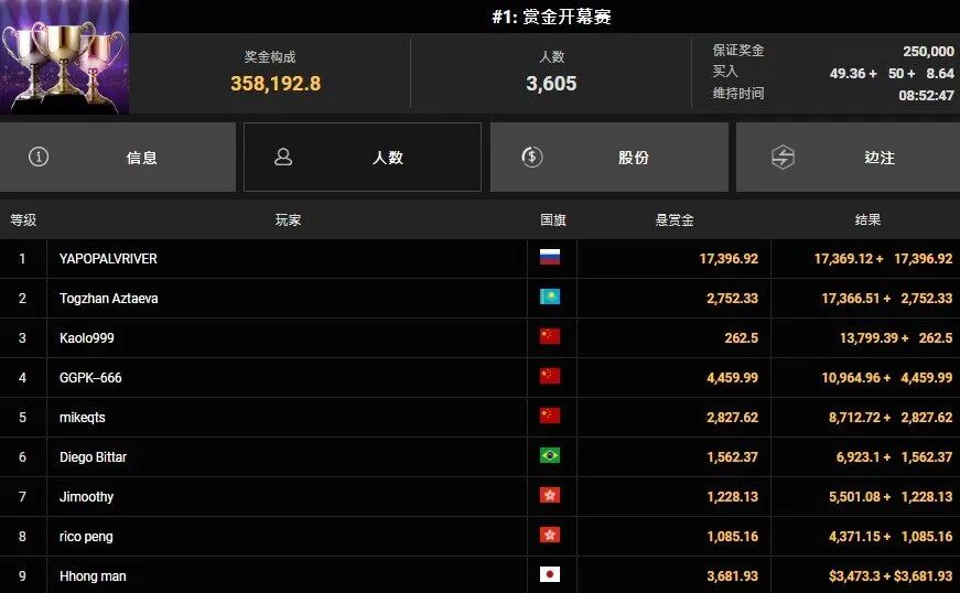赏金赛加快了比赛的进程与张力,开打不到10分钟,Kaolo999即淘汰日本选手Hhong man于第九名,紧接着GGPK—666将rico peng送出决赛桌。
