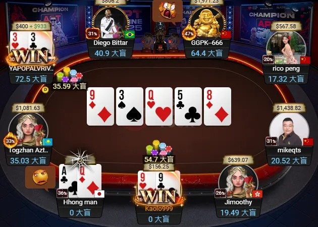 回顾决赛桌初期,国人Jimoothy手握69.6BB领先全场,而Kaolo999与rico peng则以约19BB的短码奋力追击。