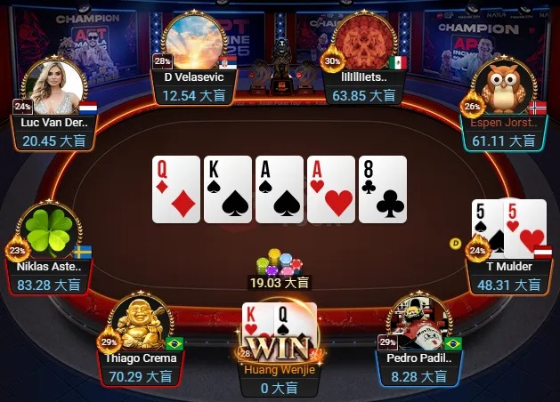 FT初始,Astedt以83.5BB领跑,记分牌最少的是黄文杰仅9BB。不过开局第二手牌,黄文杰便凭借一次KQo翻前全下跑马成功翻倍。