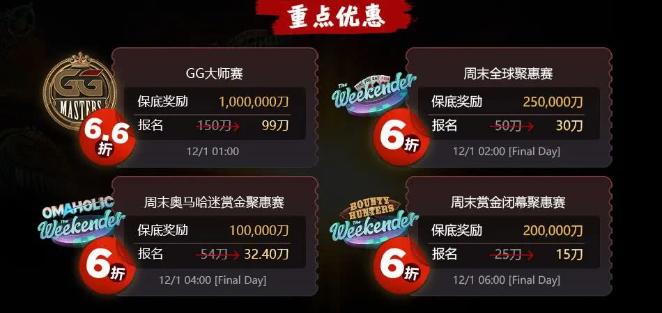 总共90场超值折扣MTT全面开打,报名最高直降90%,保底奖励竟然还不缩水。