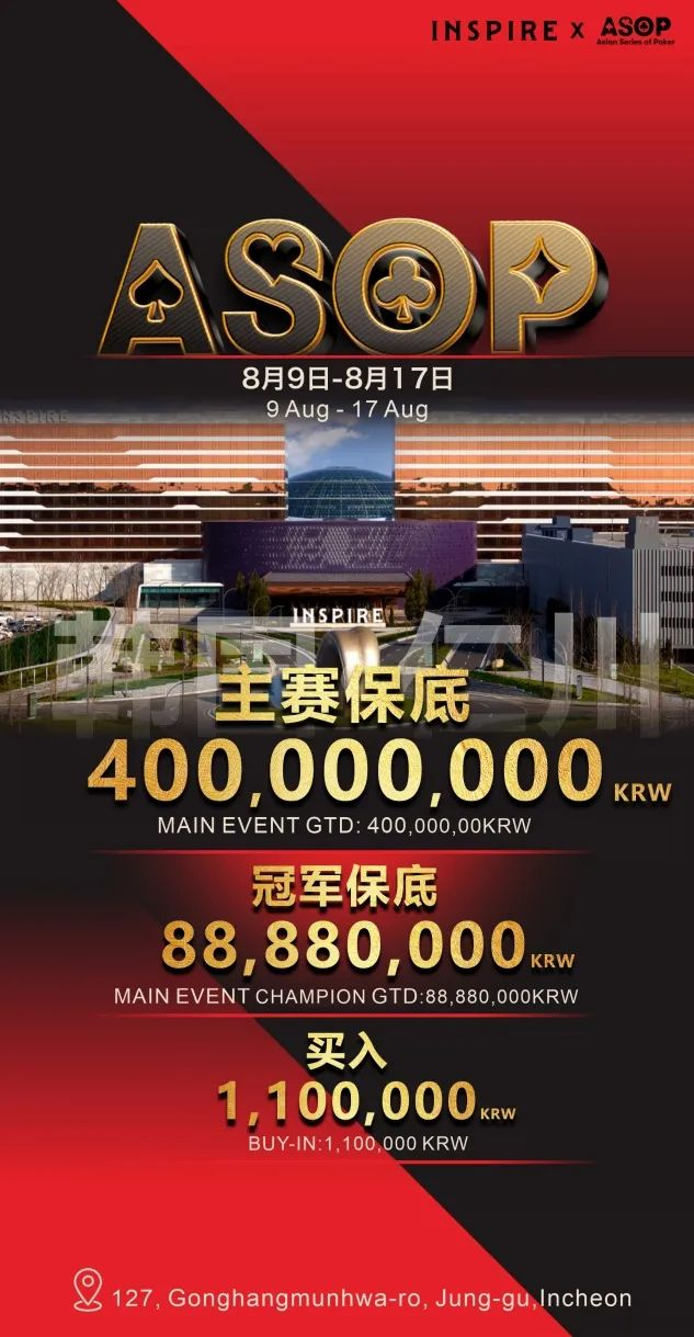 一场扑克的超级盛宴即将震撼来袭!8月9日-17日,ASOP将在韩国仁川的INSPIRE酒店热血开赛,主赛事保底400,000,000KRW,其中冠军保底88,880,000KRW,这是一场属于扑克玩家的狂欢,更是你证明自己的绝佳舞台!早鸟福利为了让更多扑克爱好者能够以最优惠的价格参与到这场盛会中,ASOP特别推出早鸟福利!凡是提前预订参赛名额的选手,可获得减...